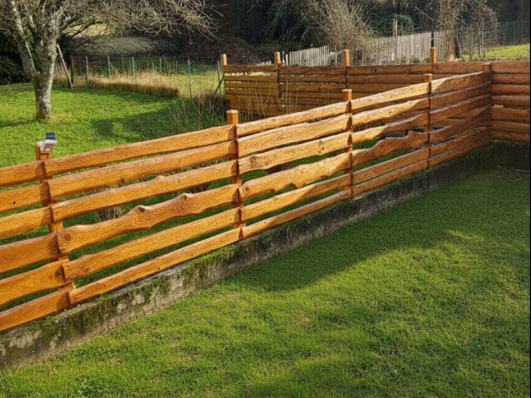 Massive Holzzäune im Bohlen-Stil überzeugen durch ihre warme Ausstrahlung und fügen sich harmonisch in Gartenlandschaften ein. Ein stabiler Betonsockel schützt das Holz und sorgt für Langlebigkeit.