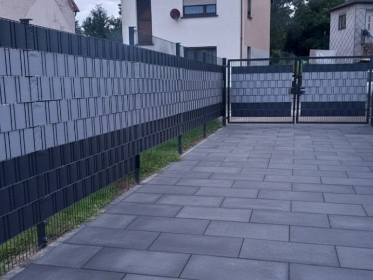 Doppelstabmattenzäune mit hochwertigen Sichtschutzstreifen in Anthrazit und Hellgrau bieten optimalen Sichtschutz bei klarer, eleganter Optik – ideal für Einfahrten und Terrassen. Die passende Pflasterung rundet das Gesamtbild ab.